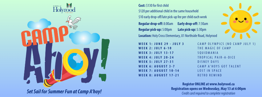 Registration for Camp A’hoy will open at 6:00pm on Wednesday, May 13, 2026.